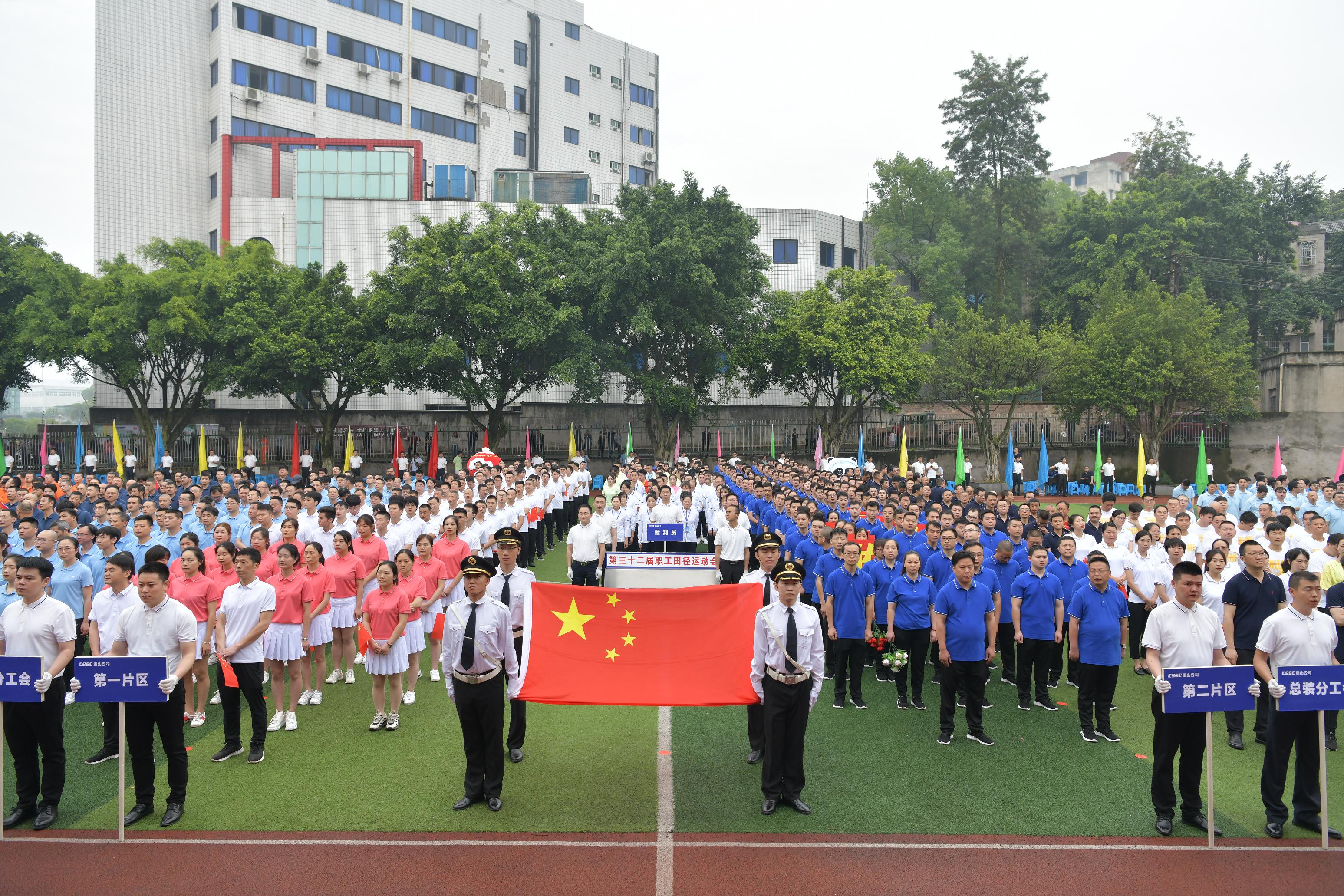2022年5月21日,重齒公司第32屆職工田徑運動(dòng)會(huì )正式拉開(kāi)了帷幕. 伴隨著(zhù)激昂的運動(dòng)員進(jìn)行曲,國旗隊、彩旗隊、裁判員隊以及各分工會(huì )著(zhù)裝整齊,精神飽滿(mǎn),依次有序的通過(guò)主席臺,接受檢閱。鮮艷的五星紅旗冉冉升起,全體干部職工在雄壯嘹亮的國歌聲中舉行了莊嚴的升國旗儀式。